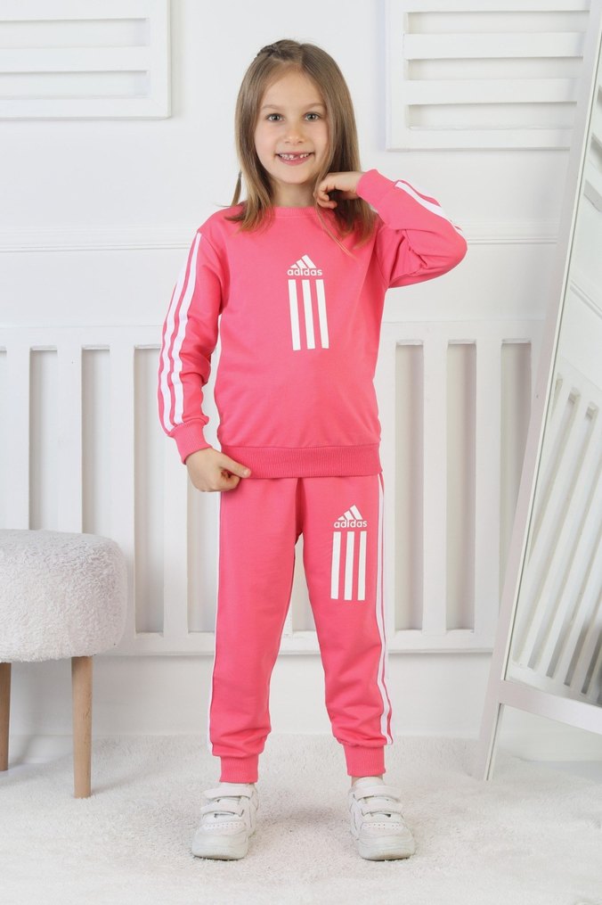 Pembe Adidas kız eşofman takımı, bol kesim, uzun kollu ve yuvarlak yaka detaylarıyla. Kollar ve pantolonda renkli baskılı çizgiler bulunur, rahat ve şık sokak stili sunar.
