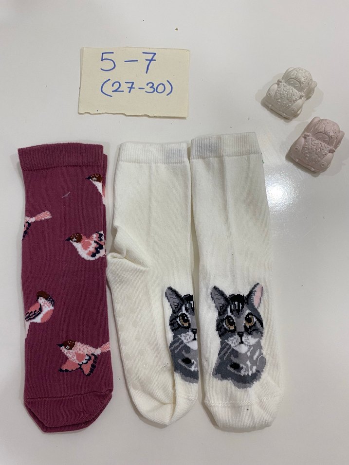 Yumuşak ve sıcak kumaştan yapılmış, baskılı desenlere sahip üçlü kız çocuk çorap seti. Beyaz çoraplarda gri kedi deseni, mor çoraplarda kuş baskısı bulunur. 27-30 (5-7 yaş).