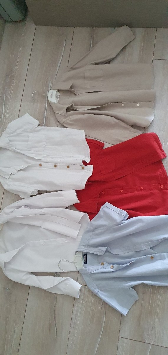 Beyaz kısa kollu keten erkek gömlek, düğmeli ön ve yakası kesimli, rahat kesim ve sade tasarıma sahip. az kullanildi, 2si uzun kollu 3ü kısa kollu