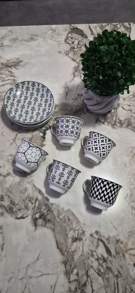 5 adet Desenli Beyaz ve Gri Kahve Fincanı Seti