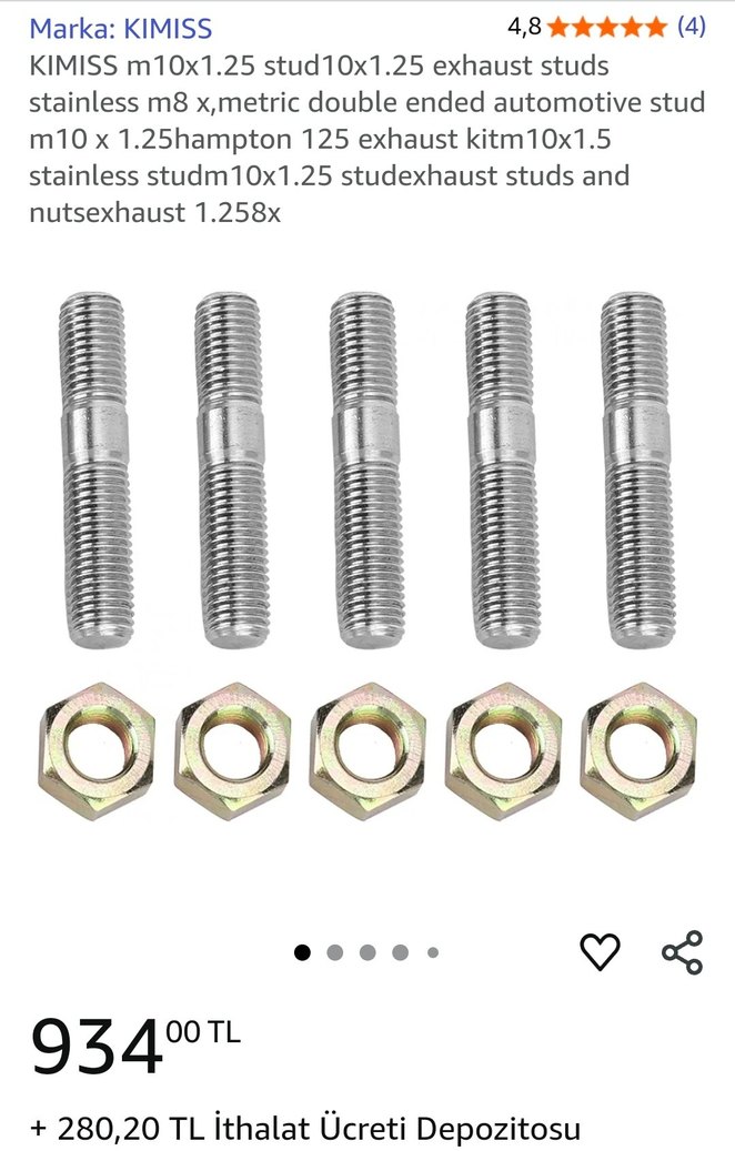 Bu görseldeki parçalar egzoz manifoldu saplaması (stud bolt) ve somunu. Ne işe yarar? Egzoz manifoldu ile silindir kapağını birbirine sabitlemek için kullanılır. İki tarafı da dişli olan saplamalar (stud bolt), bir ucu silindir kapağına vidalanır, diğer ucu manifoldu sabitlemek için somunla sıkılır. Bu sayede egzoz sızdırmazlığı sağlanır ve bağlantı sağlam olur. Hangi arabaya uyar? Ürün açıklamasında M10 x 1.25 diş ölçüsünde olduğu yazıyor. Bu ölçü birçok Japon ve Kore menşeli araçta (Toyota, Honda, Nissan, Mitsubishi, Hyundai vb.) sık kullanılan egzoz bağlantı ölçüsüdür. Ancak bu evrensel bir parça. Yani sadece tek bir markaya özel değil, uyum ölçüleri tuttuğu sürece farklı araçlarda da kullanılabilir. Diğer tüm özellikler son resimde mevcuttur. Pakette 5 adet var. Stok:1