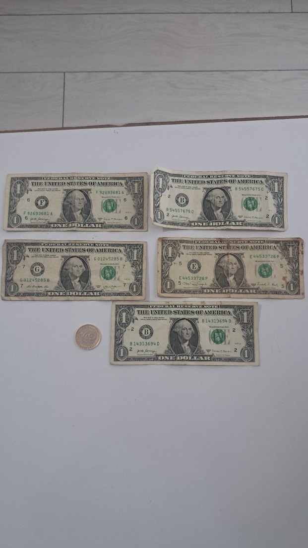 Beş adet kullanılmış Amerikan doları yer almaktadır. Banknotlarda yıpranma izleri vardır.