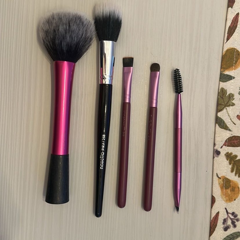 5 adet makyaj fırçası. Sağdan 2. ve 3. hiç kullanılmadı. Diğerleri az kullanıldı ve temizlendi.