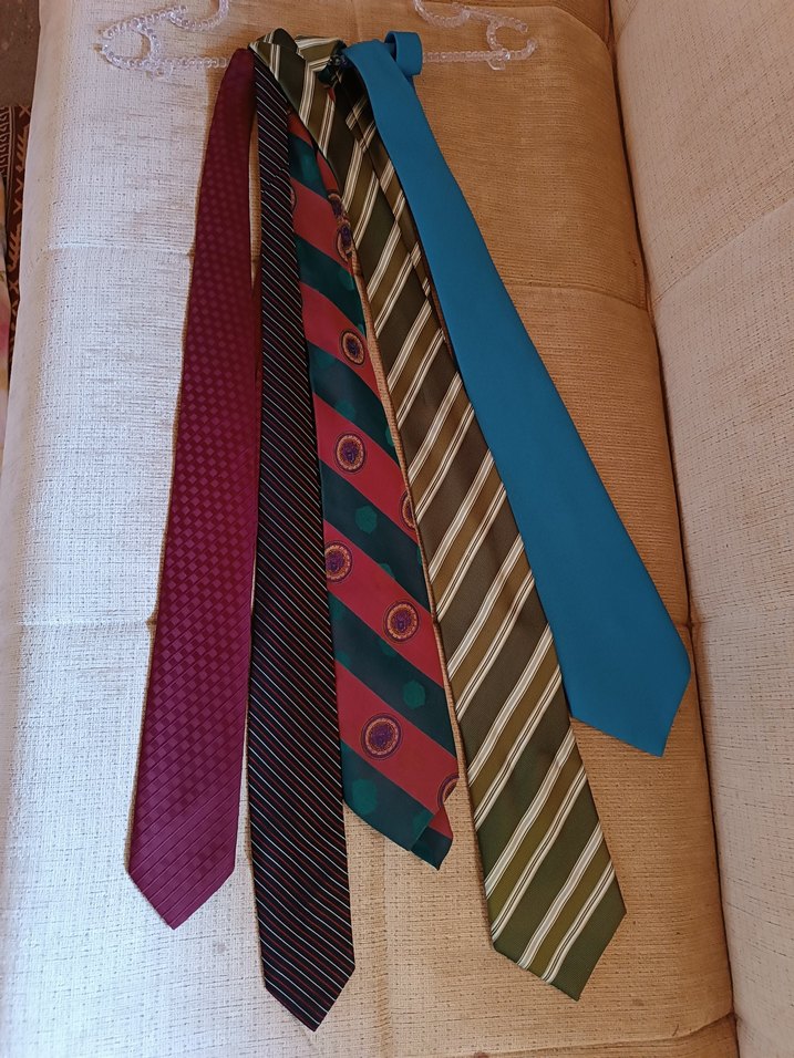 Farklı koyu ve canlı renklerde, desenli ve düz tasarımlara sahip erkek kravat seti. 5 adet kravat ( az kullandı)