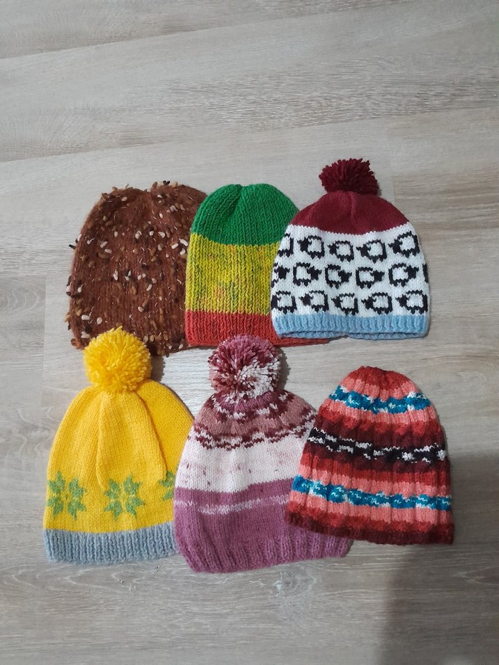Altı renkli, çeşitli desen ve ponponlu örgü bere seti. Rahat örgü kumaştan, bohem ve retro tarz için uygun.