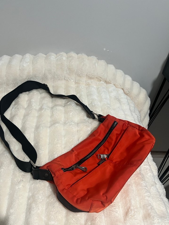 Turuncu renkte, fermuarlı ve sentetik kumaştan üretilmiş kadın çapraz çanta. Sokak modasına uygun, dış mekan ve günlük kullanıma uygun bir model.