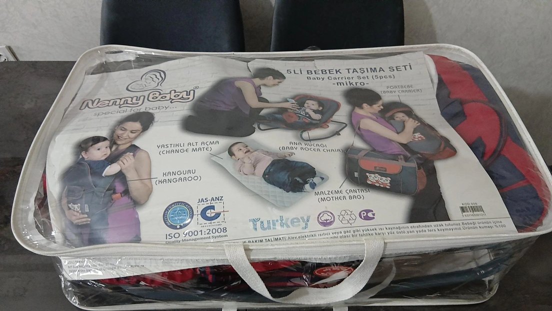 Gri desenli 5 parçalı bebek taşıma seti, anne çantası ve bebek taşıyıcı parçaları içerir.