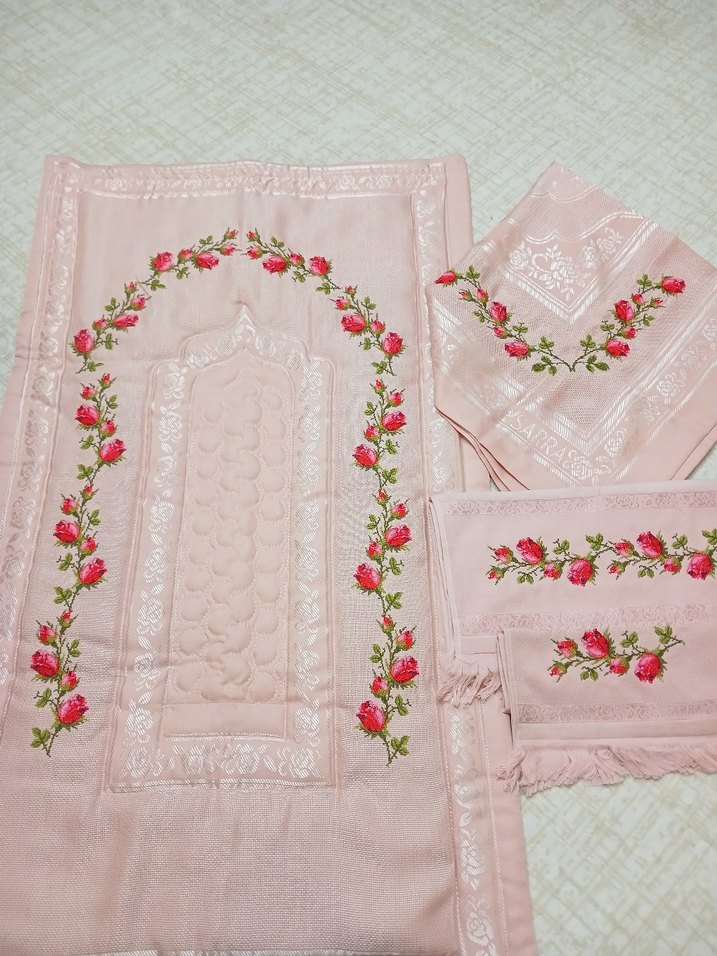 Yumuşak pembe kumaş üzerine gül ve yaprak nakışlarıyla süslenmiş, püsküllü kenarları ve zarif dokuma detayları bulunan makine işi set