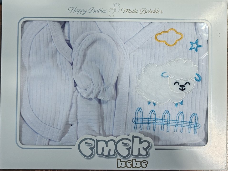 Nakışlı kuzu ve bulut desenli beyaz erkek bebek bornoz seti, eldiven dahil. Yumuşak kumaş, banyo sonrası konfor sağlar.