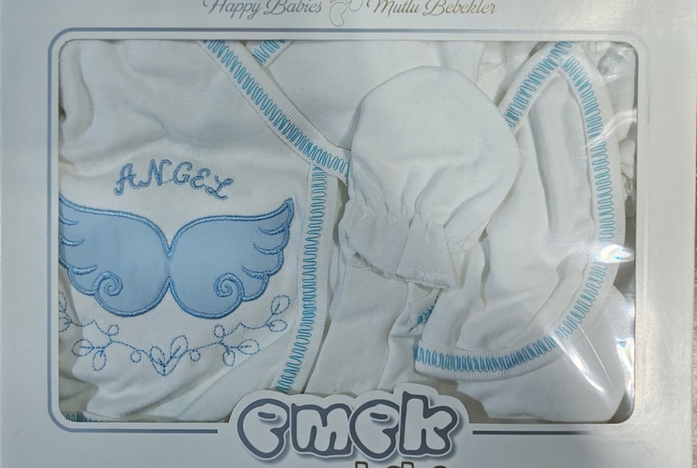 kanat detaylı erkek bebek hastane çıkış seti önlük,bere,eldiven ve alt üst takımdan oluşuyor
