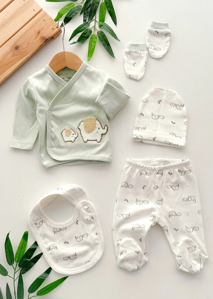 Punch işlemeli minik fil ailesi yandan çıtçıtlı mevsimlik yenidoğan 5li set 0 pamuk