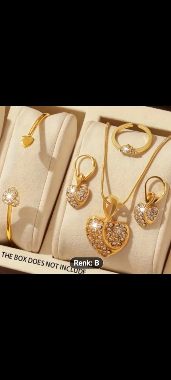 Altın renkli taşlı kalp figürlü kolye, yüzük, bileklik ve küpe seti. ✨