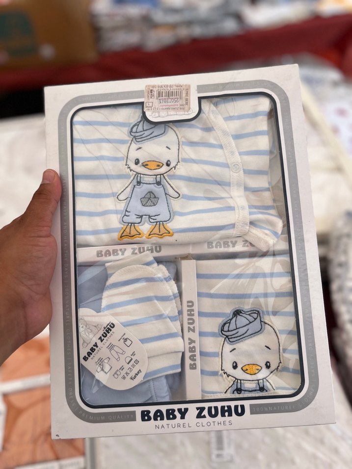 Pastel mavi pamuklu erkek bebek hastane kıyafeti, baskılı ördek deseni, kısa kollu ve düğmeli. Şapka ve eldivenler Baby Zuhu markalıdır.