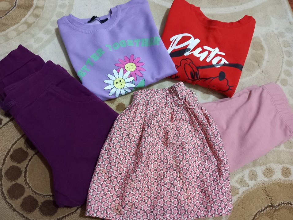3-4 yaş için 5 parça kız çocuk kıyafeti.Hepsi tertemizdir.2 sweatshirt, 1 eşofman altı,1 etek ve 1 tanede diz altı tayttan oluşmaktadır.Hepsi çok temiz kullanıldı.Etek ve kırmızı sweatshirt 2-3 yaşa daha uygundur.Lila sweatshirt sadece 1 kez giyildi.Etek KOTON ,diğerleri LCW ürünüdür.
