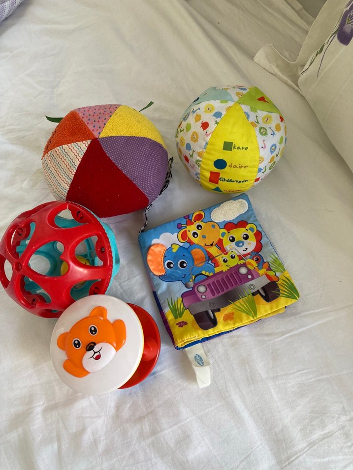 Yumuşak kumaş toplar, kırmızı plastik top, ayıcık yüzlü çıngırak ve hayvan figürlü kumaş kitap içeren renkli diş kaşıyıcı ve çıngırak seti. Hışırtılı kitap