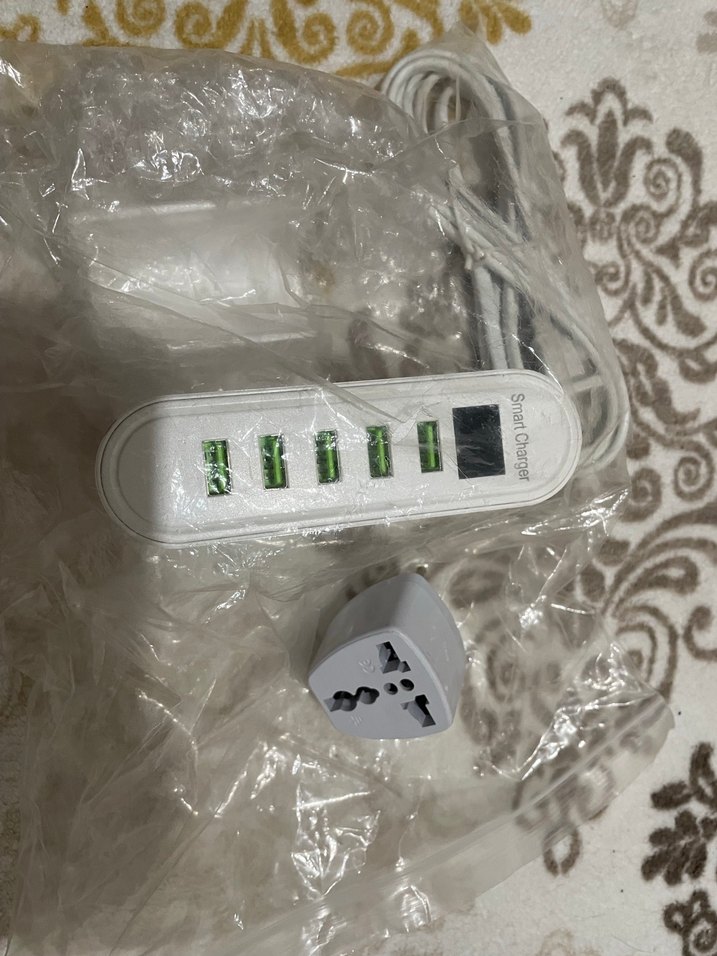 5 USB portlu beyaz akıllı şarj cihazı ve evrensel priz adaptörü ile çoklu cihaz şarj imkanı. Hafif renk ve kompakt tasarım. amerikan dönüştürücü var