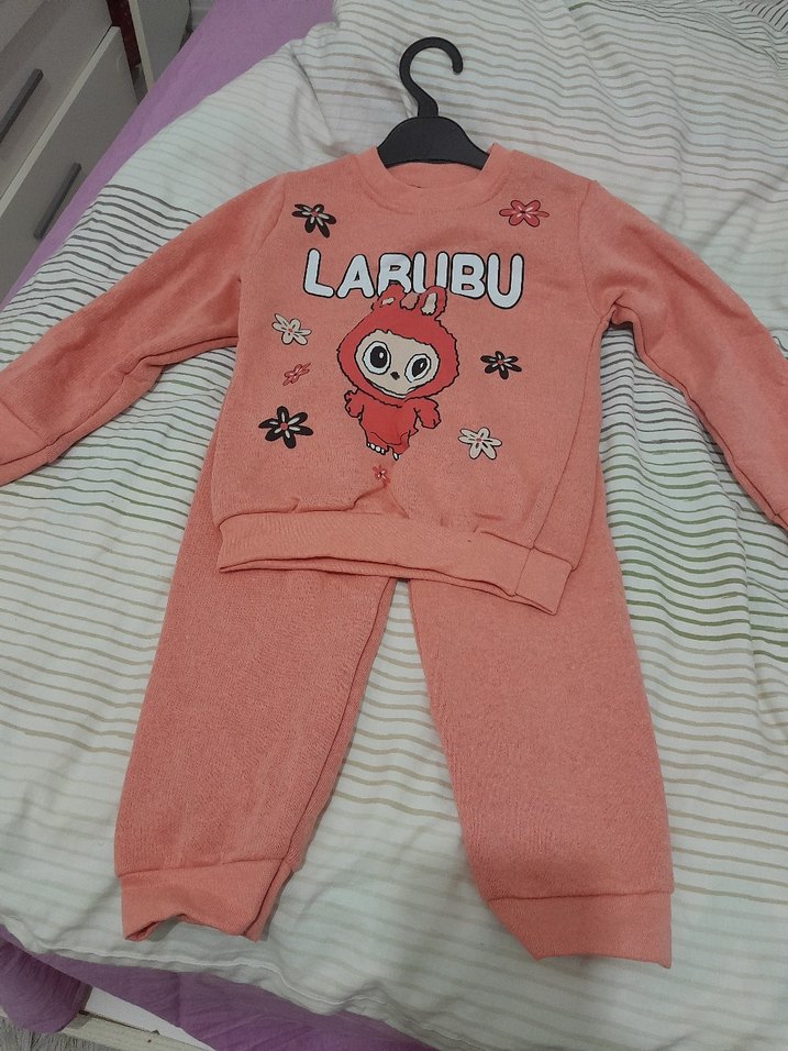 Pembe renkli, triko kumaştan yapılmış, baskılı ve LARUBU yazılı kız çocuk eşofman takımı, bol kesim ve uzun kolludur.