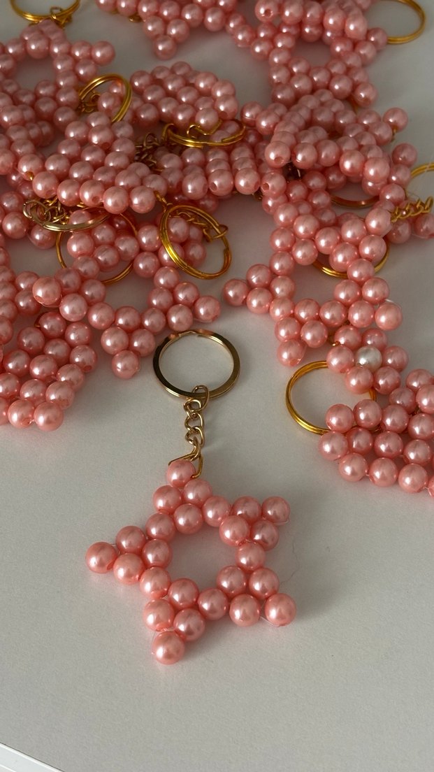 Pembe boncuklardan yapılmış yıldız şeklinde anahtarlık, altın renk zincir ve halka ile sade, Paris tarzı bir tasarıma sahip.