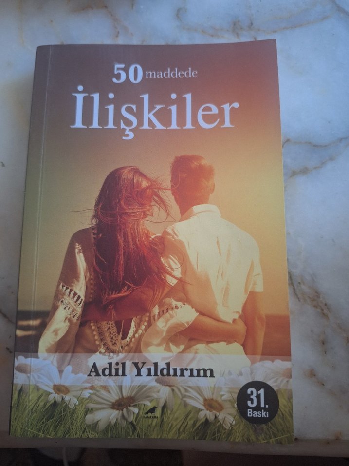 Adil Yıldırım'ın 50 Maddede İlişkiler adlı romanı, ilişkileri 50 maddede ele alır. 31. baskıdır, üzerinde çift ve papatyalar var.