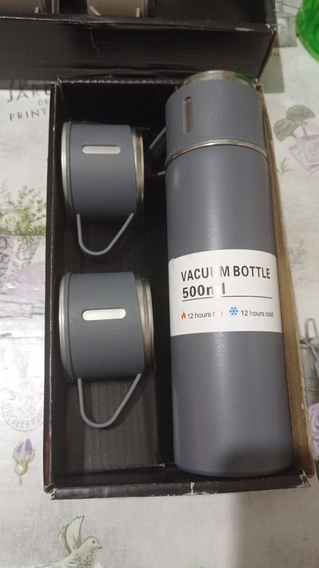 500 ml kapasiteye sahip gri vakumlu termos şişe, içecekleri 12 saate kadar sıcak veya soğuk tutar. İki kulplu küçük bardak içerir. ☕