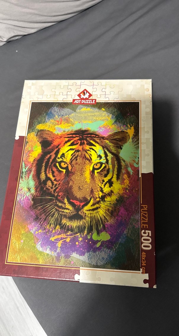 Renkli kaplan tasarımlı 500 parçalık puzzle. Boyutu 48x34 cm, Art Puzzle markasına ait.