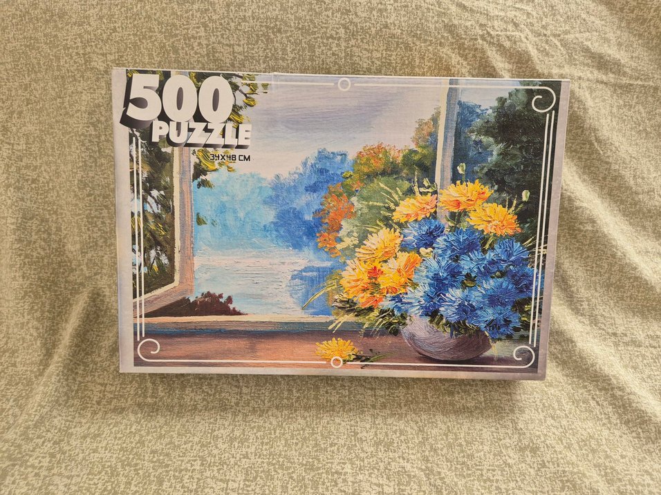 34x48 cm ölçülerinde, mavi ve sarı çiçeklerin yer aldığı 500 parçalı renkli puzzle.