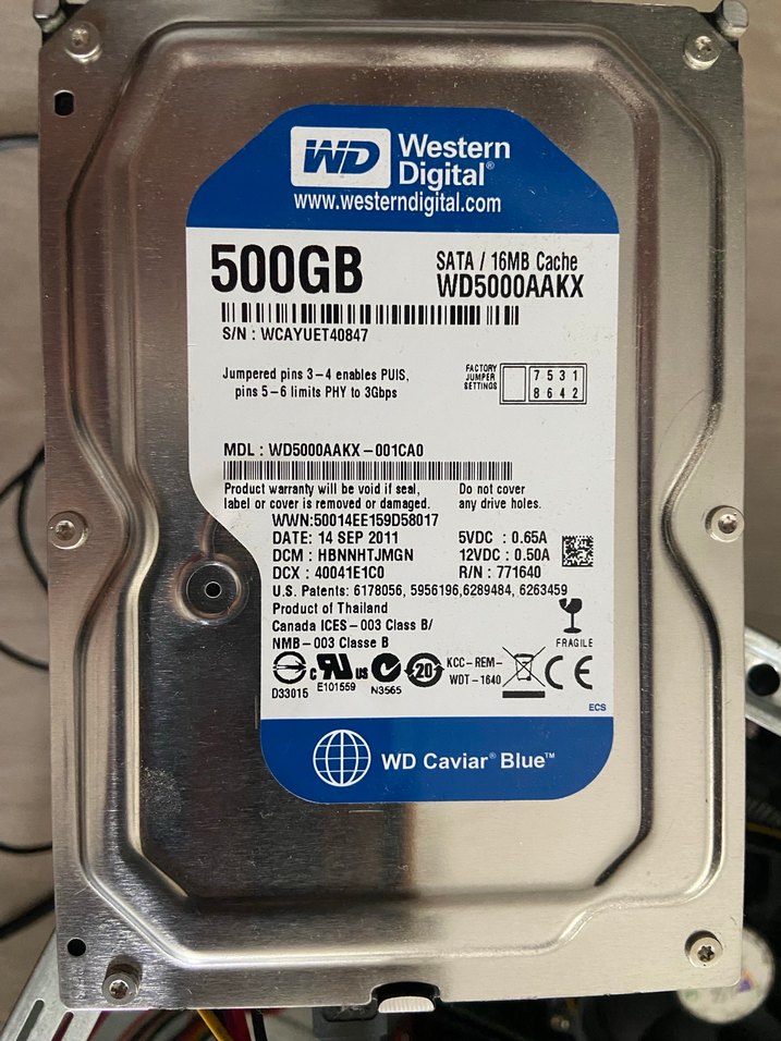 Western Digital WD Caviar Blue sabit disk 500GB depolama, SATA arayüzü ve 16MB önbellek sunar. Koyu mavi etikete sahiptir. ⚙️