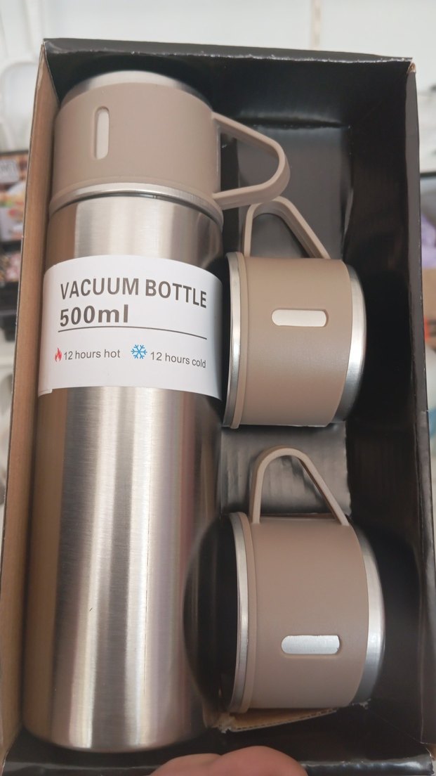 500ml kapasiteye sahip bej vakum termos, içecekleri 12 saat sıcak ve soğuk tutar. İki çıkarılabilir kapak ile kullanışlıdır.
