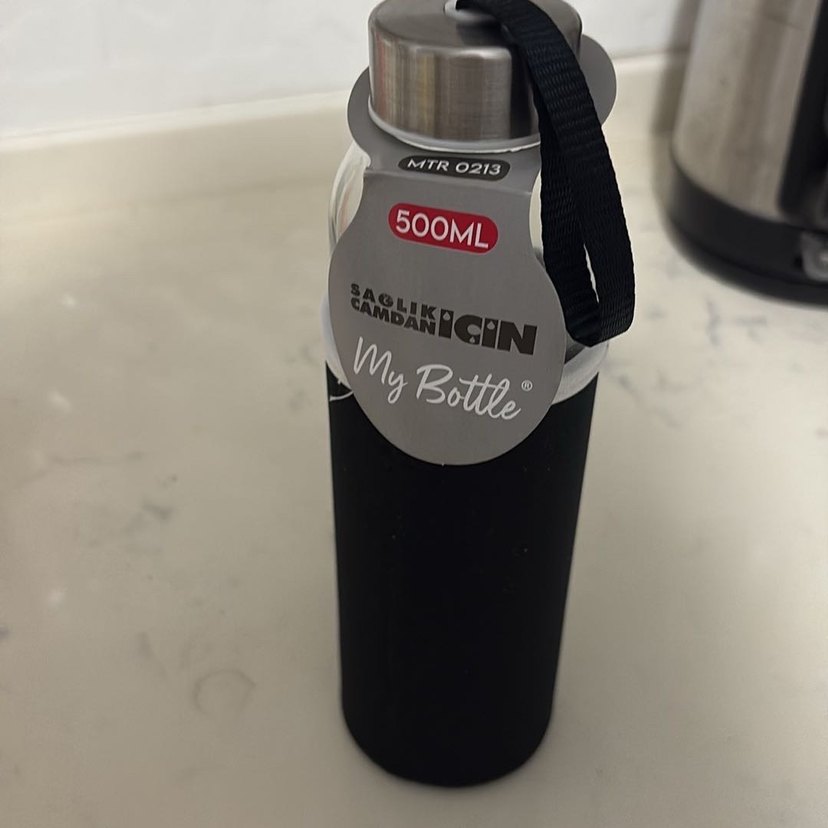 500ML kapasiteli siyah cam şişe, metal kapak ve taşıma kayışı ile sağlıklı içim sağlar. My Bottle markalıdır.
