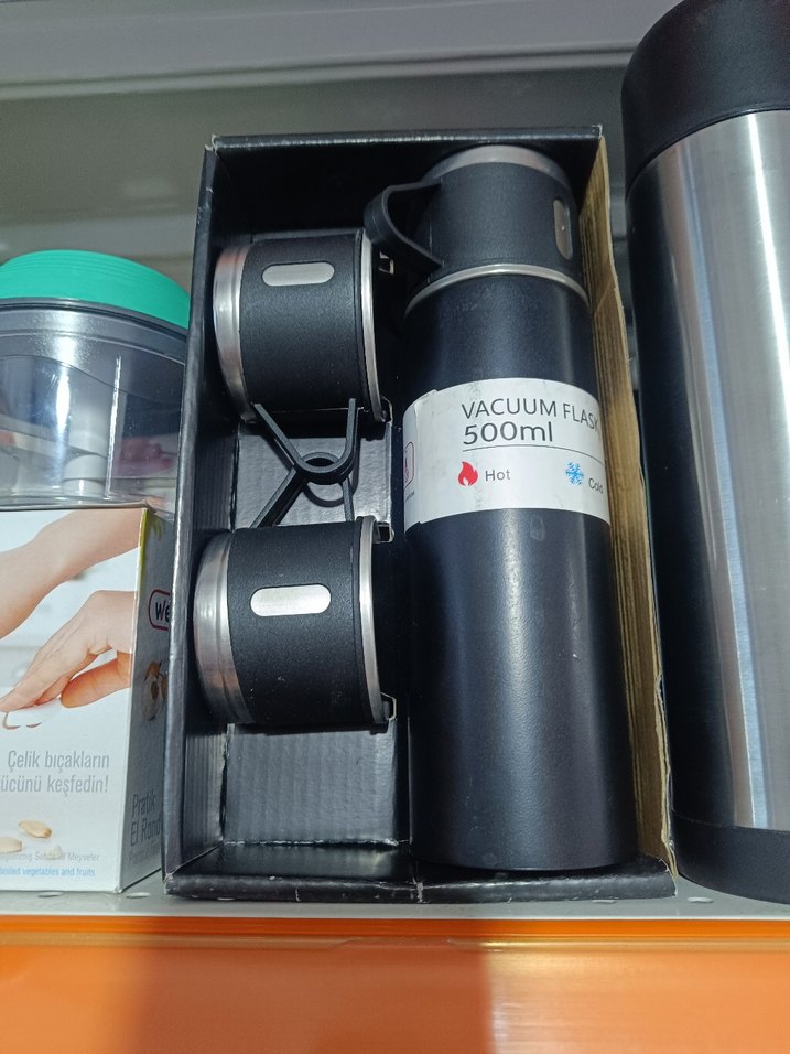 500ml kapasiteli siyah vakumlu termos, içecekleri sıcak veya soğuk tutar. İki çıkarılabilir bardakla birlikte gelir.