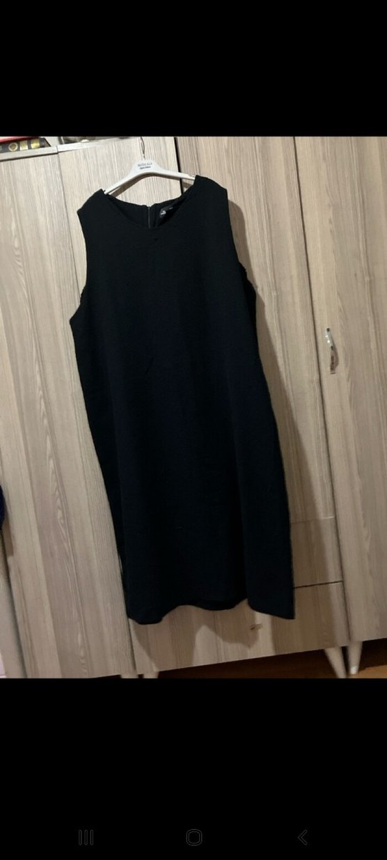 Siyah kolsuz midi elbise, salaş kesim ve yuvarlak yaka. İki göğüs arası 65 cm boy 128 cm basen 70 cm likrali esnek astarsiz iç gostermez tok bir kumaş