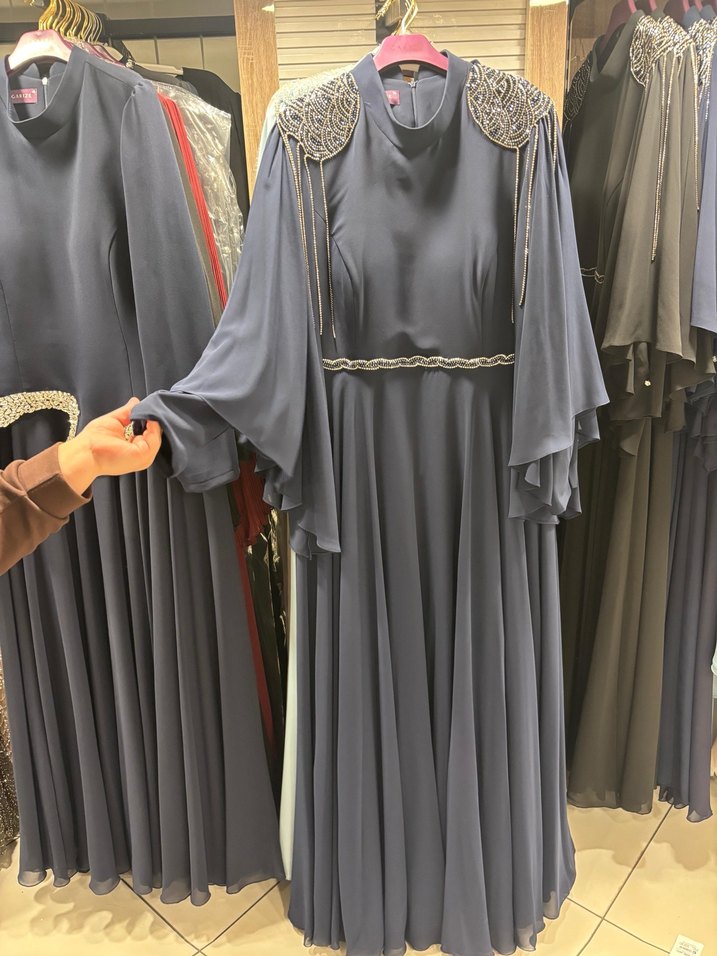Yüksek yakalı, uzun kollu, bol kesim abiye elbise. Omuzlarda detayları ve drapeli bel tasarımı ile düğün için uygun.