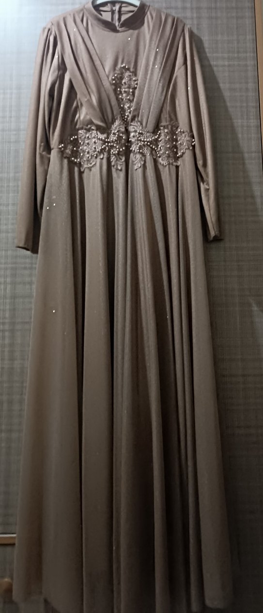 54 beden Bej Uzun Kollu Dökümlü Abiye Elbise