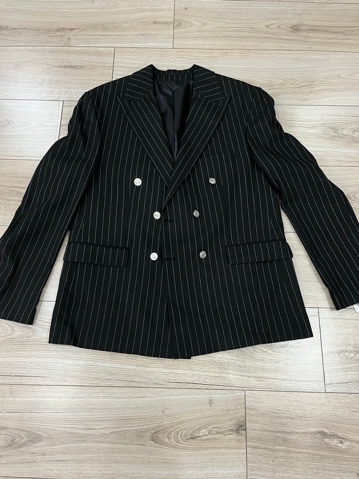 56 DROP /6 Düğmeli, çizgili siyah erkek takım . Normal kesim, uzun kollu ve notched yaka tasarımıyla ofis ve günlük kullanıma uygundur. ️