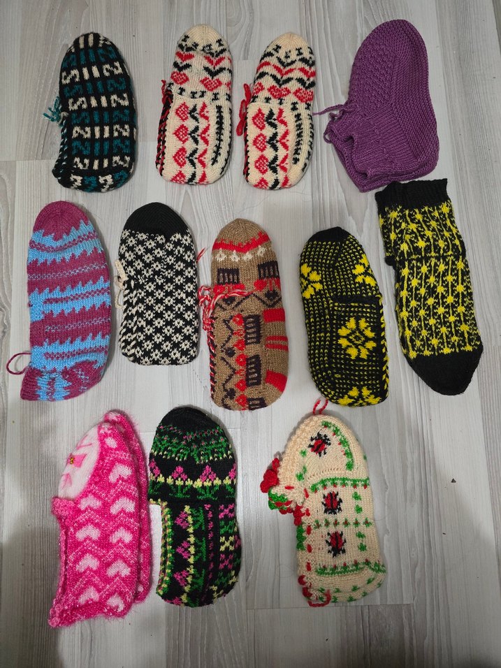 Çeşitli geleneksel desenlerde ve canlı renklerde el örgüsü yün çoraplar, sıcaklık ve konfor sağlar.