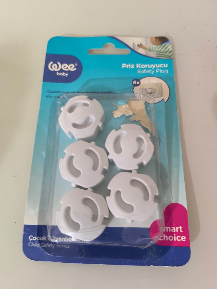 Altı adet beyaz priz koruyucu seti, çocukların elektrik prizlerine erişimini engeller ve güvenliği artırır. ️