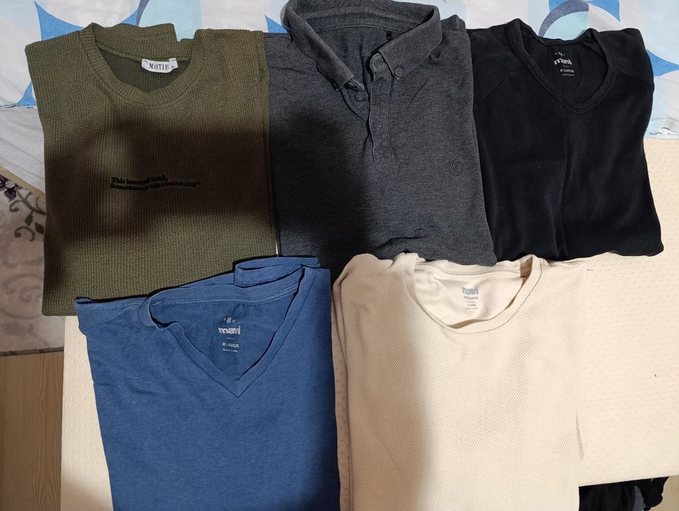 Gri pamuklu kumaştan, uzun kollu, yuvarlak yakalı ve bol kesim erkek polo tişört. Desensiz yapısıyla günlük kullanıma uygun, rahat ve şık bir görünüm sunar. krem ve yeşil uzun kollu diğerleri kısa kollu hepsinin bedeni xL