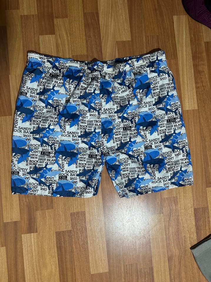 Renkli baskılı desenlere sahip, mavi tonlarında, bol kesim erkek mini şort. Plaj ve streetwear tarzı için uygun, trend bir görünüm sağlar.