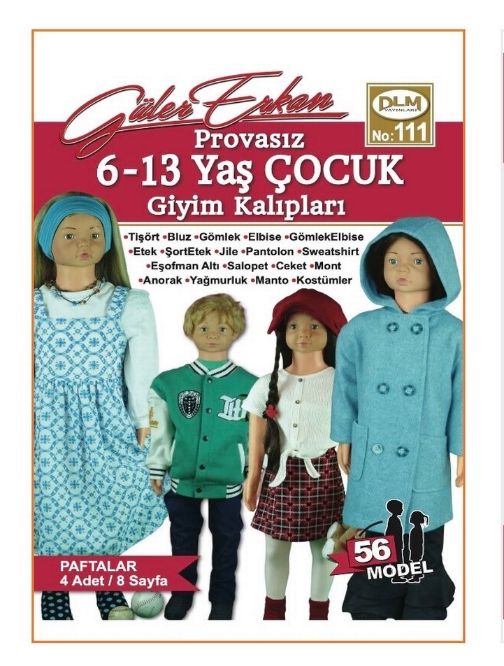 6-13 yaş çocuklar için tişört, bluz, elbise, pantolon, mont ve daha fazlasını içeren 56 modelden oluşan 4 adet, 8 sayfalık giyim kalıpları kitabı.