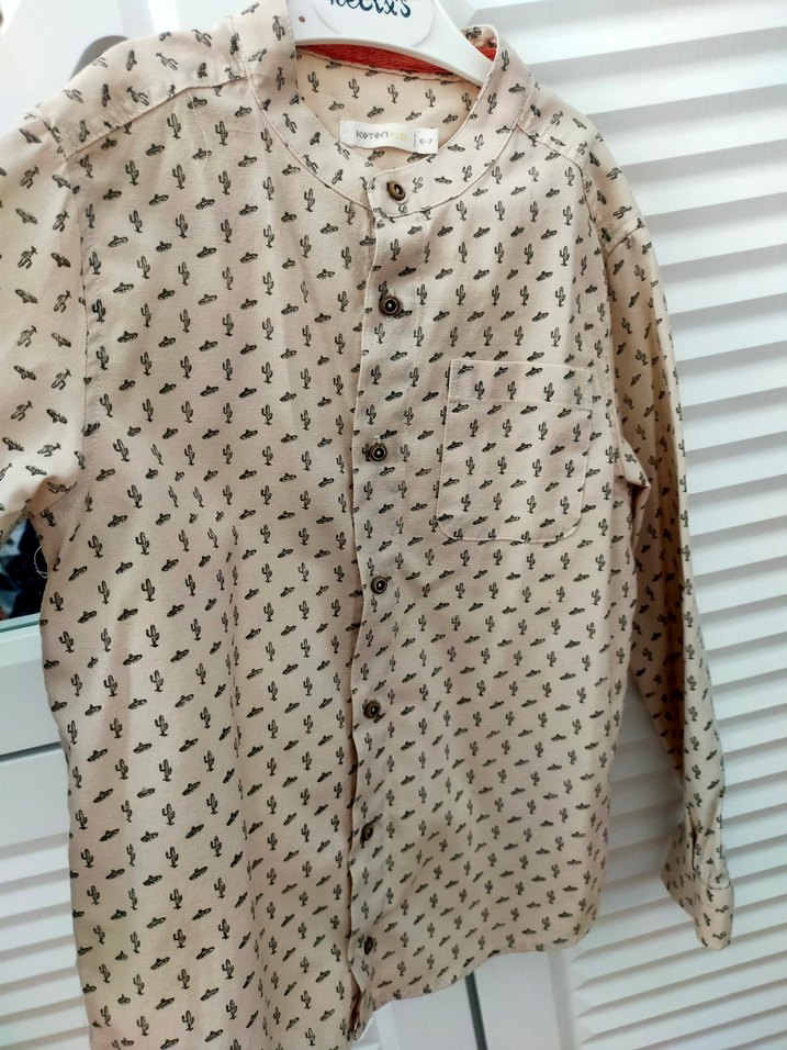 Bej renkli, pamuklu, bol kesim erkek çocuk gömleği. Uzun kollu, düğmeli ve bohem desenli, yakası çentikli tarzda.