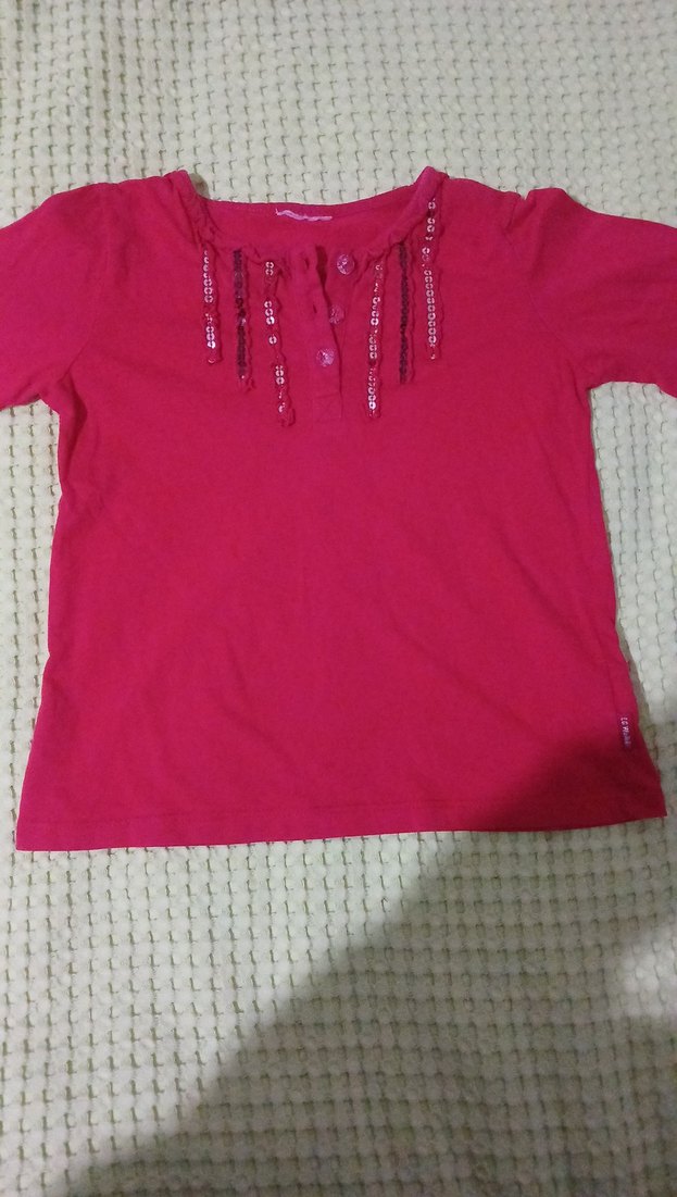 Pembe renkli, uzun kollu kız çocuk tişörtü, yuvarlak yaka ve bol kesime sahiptir. Ön kısmında düğme ve pul süslemeleri bulunur, yumuşak sentetik kumaştan üretilmiştir.