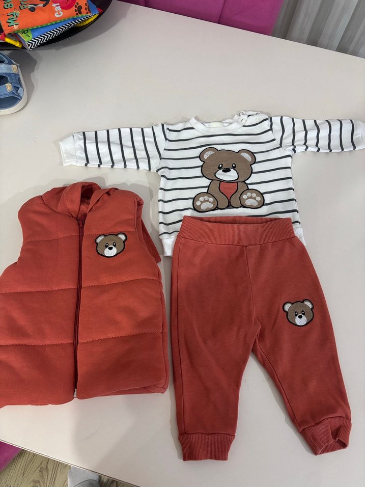 Uzun kollu çizgili ve ayıcık baskılı üst, ayıcık detaylı kahverengi pantolon ve örme kahverengi yelekten oluşan sıcak tutan üçlü erkek bebek takımı. Temizdir