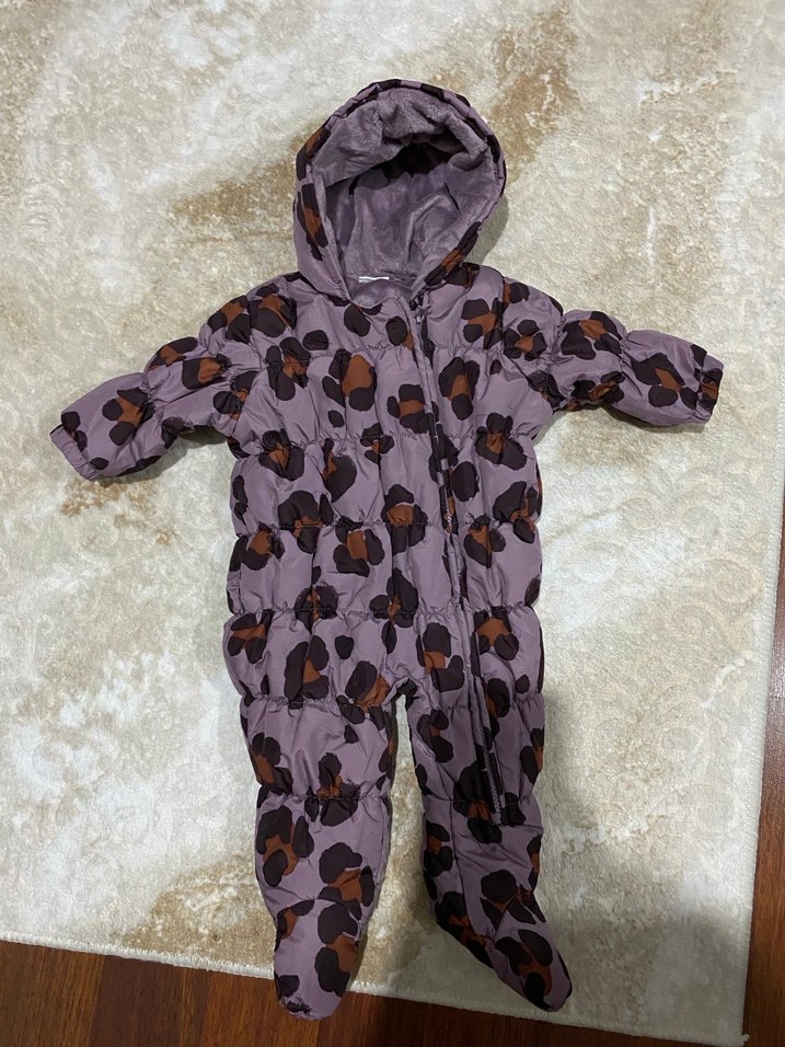 Kürklü kapüşonlu, mor renkli leopar desenli bebek tulumu, sıcak tutar ve rahatlık sağlar.