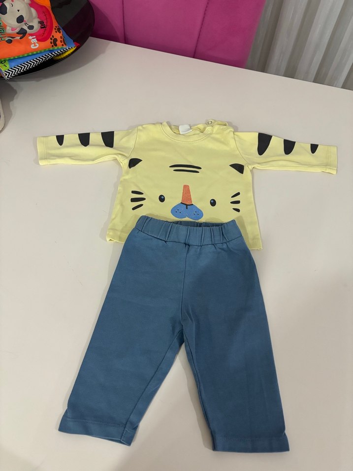 Uzun kollu sarı üstü renkli baskılı kaplan yüzü ve örme detaylı, rahat mavi pantolonlu bebek takımı. Yuvarlak yaka konfor sağlar. . Ütün temizdir