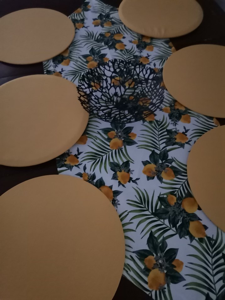 Suplalarımız sarı duck kumaş runnur ise beyaz zemin üzerine sarı ve yeşil renkten Oluşmakta limon ve Yaprak desenlidir
