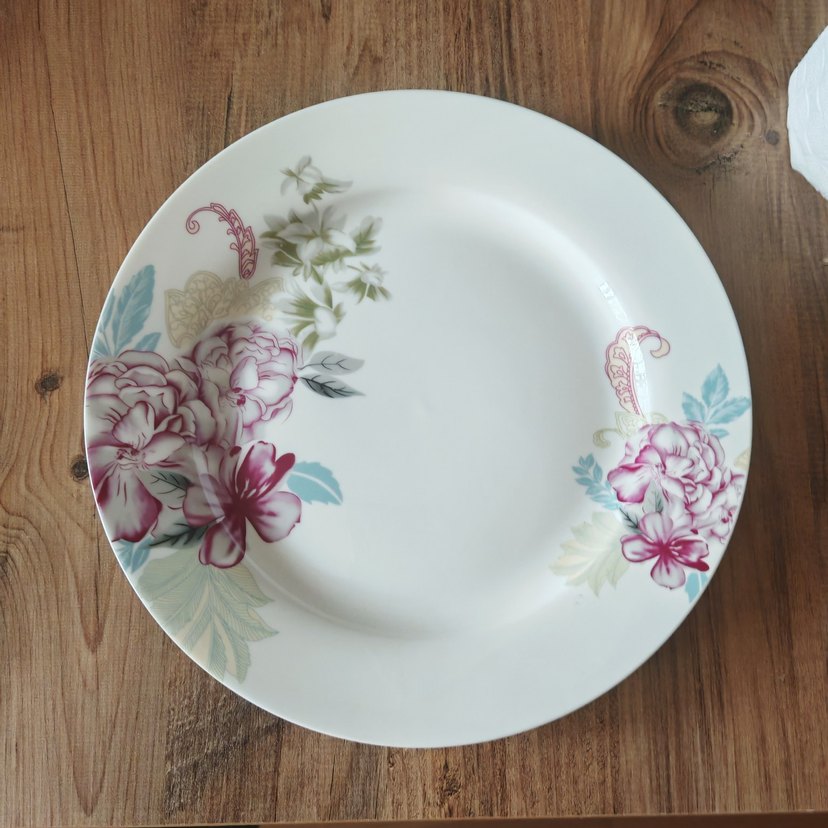 Pastel tonlarda çiçek desenlerine sahip beyaz tabak, yumuşak renkler ve pürüzsüz yüzey sunar. cok az kullanıldı herhangi bir kusuru yok ...markası evino
