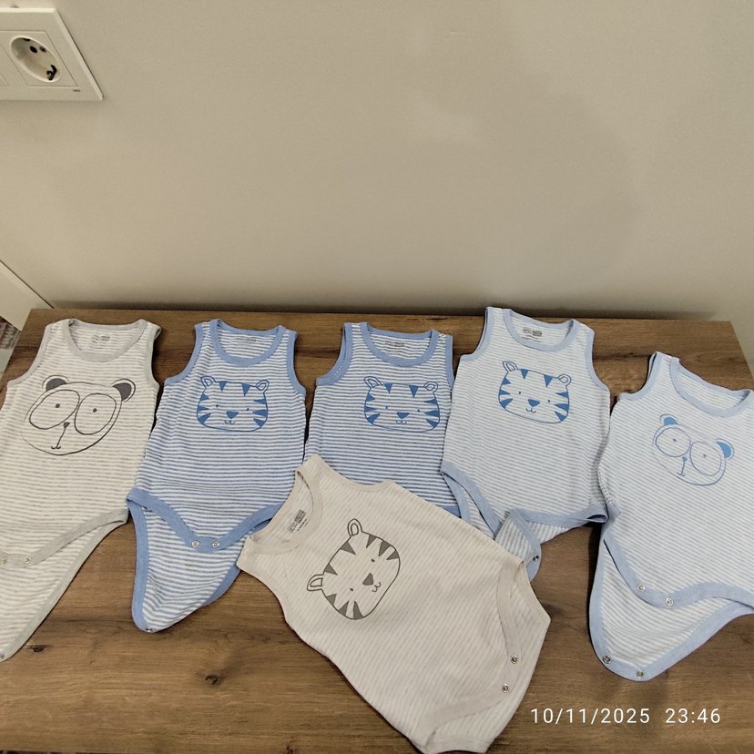Örme kumaştan, askısız yaka ve gri zebra desenli, mavi çizgili erkek bebek çıtçıtlı body.