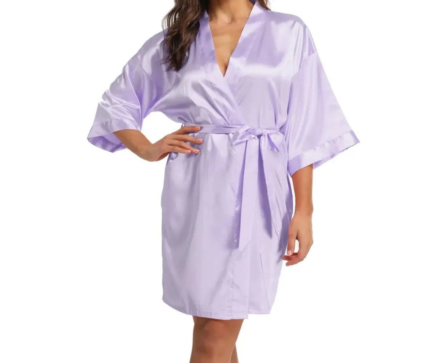 Mor renkli midi boy, salaş kesim, askılı kollu, desensiz sabahlık. Yumuşak dokulu kumaş ve belden bağlamalı tasarıma sahiptir.