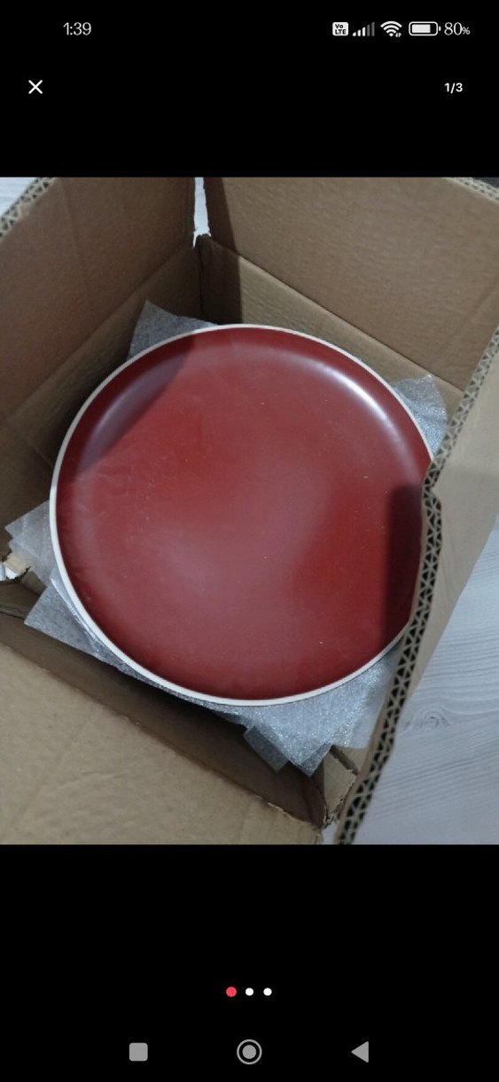 Koyu kırmızı renkte 6 adet servis tabağı. birinin üst yüzeyinde olmak üzere diğerlerinin alt taraflarında renk deformesi mevcut.