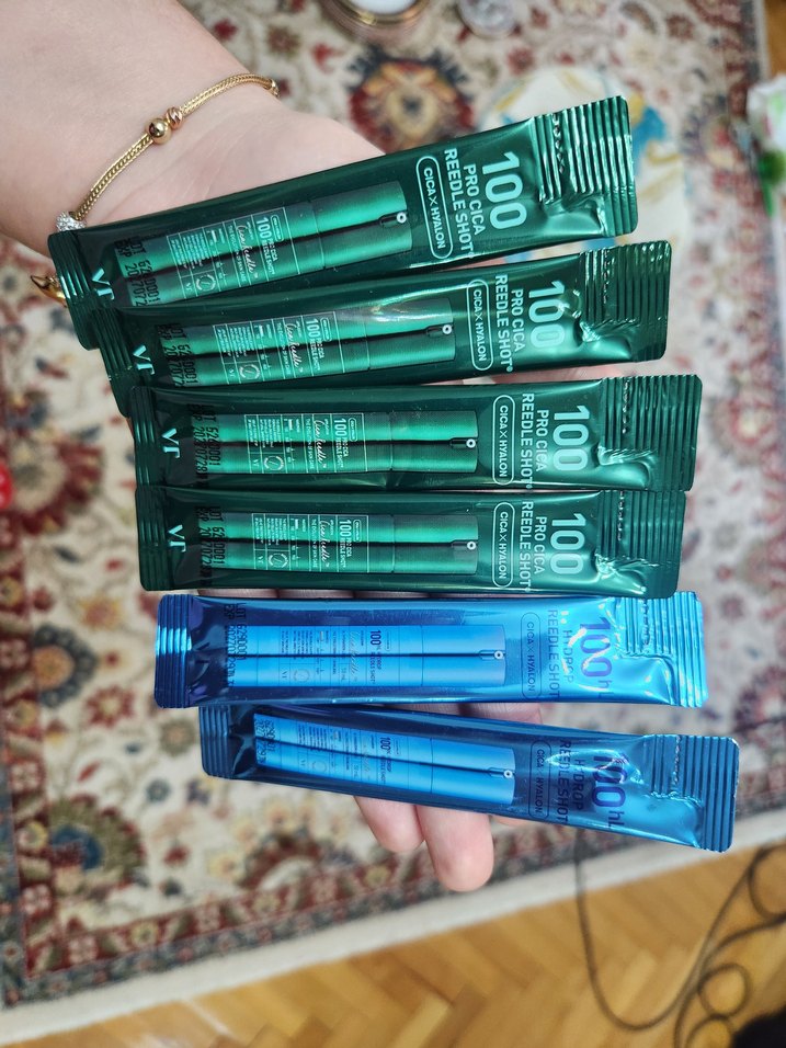 VT 100 Pro Refresh Shot ampuller, cilt yenileme ve bakım için yeşil ve mavi ambalajlarda sunulur. Her ampul, hedefe yönelik yoğun formüller içerir.